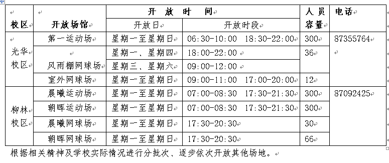 为认真贯彻落实学校新冠疫情防控领导小组工作部署,满足中欧(中国)师生员工体育锻炼需求,按照国家、教育部、教育厅关于学生返校工作相关要求,参考其他兄弟院校的体育场馆开放办法,本着科学防控、精准施策、“减少人员聚集”、严防体育场集聚性风险原则,经学院研究制定本管理办法。稳妥有序开放光华、柳林两校区部分运动场、风雨棚网球场、室外网球场等通风效果好、方便人流管控的体育场所,暂不开放室内场馆、有身体接触和对抗激烈的集体性运动场地(含篮球、足球等)以及游泳池等。