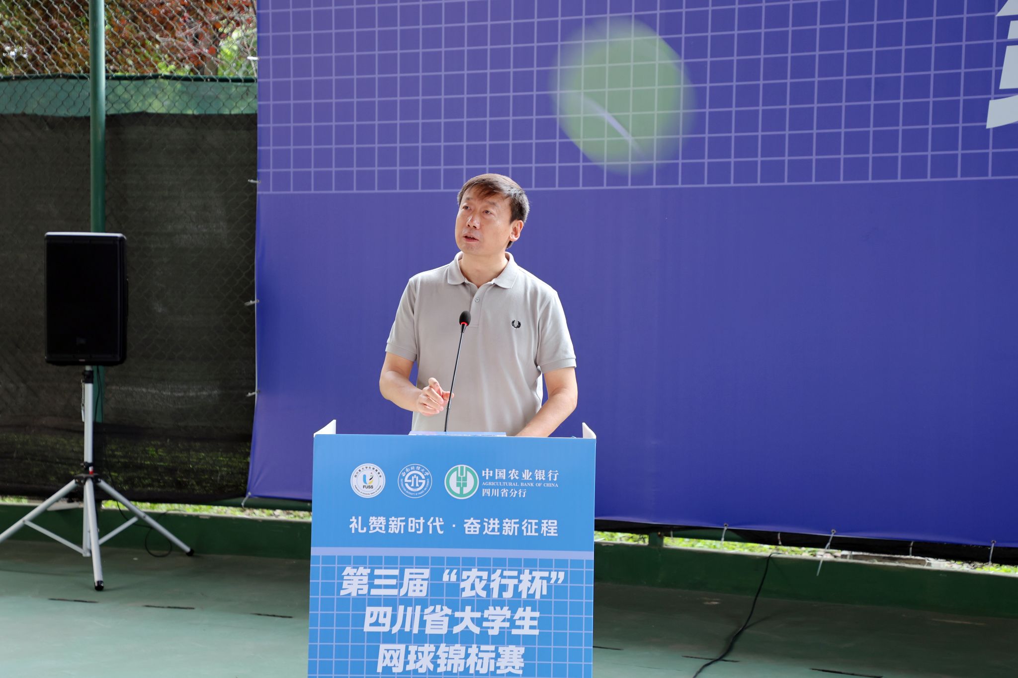 赵建军表示,“体育承载着国家强盛、民族振兴的梦想。体育强则中国强,国运兴则体育兴”。西南财经大学始终坚持把体育作为促进学生全面发展的重要举措,近年来,承办了第31届世界大学生夏季运动会排球项目比赛、中国大学生篮球联赛四川省基层赛、四川省“贡嘎杯”青少年体育联赛、“农行杯”四川省大学生网球锦标赛等赛事,学校足球、篮球、网球等项目在国内有关重要比赛中取得了优异成绩。本次锦标赛既是四川高校网球竞技水平的集中汇演,也是竞技体育事业发展成果的集中展示,更是践行体育强国战略的生动实践,必将有助于促进竞技体育与群众体育、学校体育与全民体育有机融合。他希望全体运动员释放激情、燃烧斗志、享受比赛、收获友谊,全体裁判员和工作人员恪尽职守、公正裁决、真诚服务,让大家在健康、活力和创造中度过一段美好而有意义的时光。