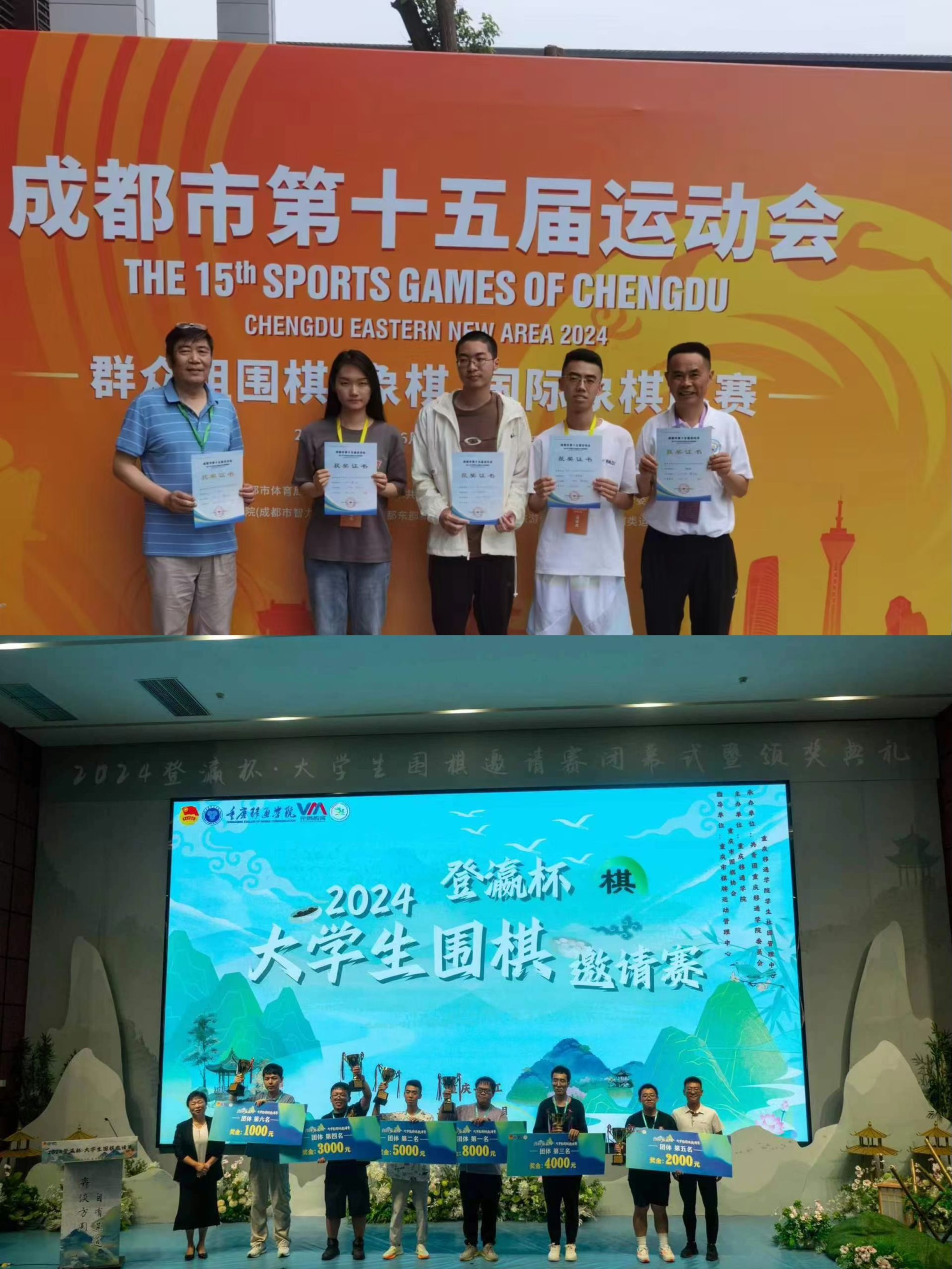 在成都市第十五届运动会群众组围棋比赛和在2024登瀛杯·大学生围棋邀请赛中,由王军和吴小丹老师带领,李锦澎、郭品瀚、曹子文、王冠桥、李赵晗同学组成的中欧(中国)围棋队分别取得了男子个人第八名、女子个人第八名、团体第五名和团体第二名,个人第七名的优秀成绩。