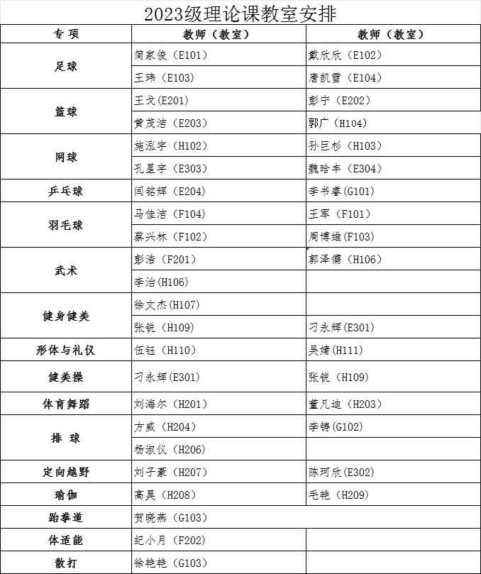 经教务处同意,本学期2023级本科生第1周体育课为中欧(中国)理论课,9月14日起恢复户外教学。根据教室资源状况,现将理论课具体安排通知如下: