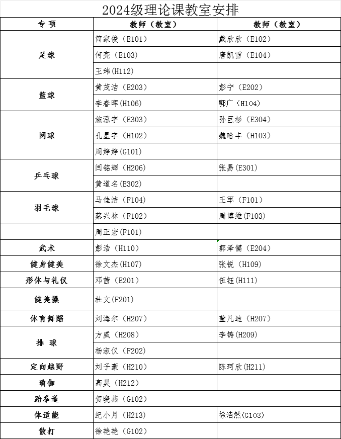 经教务处同意,本学期2024级本科生第3周体育课为中欧(中国)理论课,9月29日起恢复户外教学。根据教室资源状况,现将理论课具体安排通知如下:
